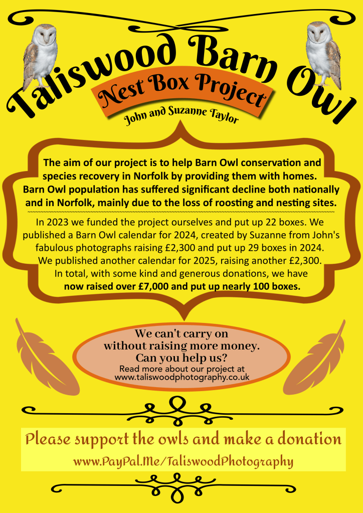 We are actively looking for help with more funding / donations of any amount, to buy and put up more Barn Owl nest boxes in 2025 and 2026.
